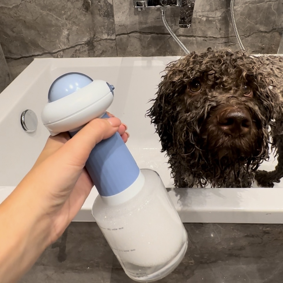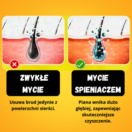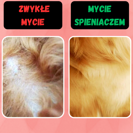 Nasz inteligentny dozownik, w przeciwieństwie do tradycyjnego namydlania, powoduje że piana jest równo rozprowadzona po zwierzęciu i wnika dużo głębiej. W przypadku tradycyjnego mycia piana zatrzymuje się tylko na powierzchni skóry co powoduje że pozbywasz się brudu tylko powierzchniowo. Dodatkowo z naszym spieniaczem wykąpiesz zwierzaka w 5 min, bez bałaganu i rozchlapanej wody a Twój pupil wyjdzie z kąpieli czyściutki i zrelaksowany.